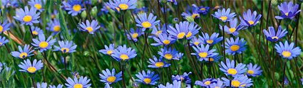 Felīsija (Felicia amelloides). Kurvjziešu jeb asteru (Asteraceae) dzimta. Felīsijai ir nelielas ovālas aromātiskas lapas un no vasaras vidus tā zied ziliem, margrietiņām līdzīgiem ziediem (mēlziedi) ar dzeltenu vidu (stobrziedi). Ziedi ir smaržīgi un zied ilgstoši. Pieejamas arī baltas felīsijas. Atkarībā no klimata var būt viengadīgs vai daudzgadīgs augs.