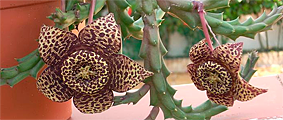 Stapēlija, raibā stafēlija (stapelia variegata), Oleandru (apocynaceae) dzimta, Asklēpiju apakšdzimta (Asclepiadaceae), stapēliju ģints. Krāšņākie ziedi ir milzu stapēlijai (stapelia gigantea). Dtapēliju dzimtā iekļauti arī tādi interesanti augi kā orbeja un huernija, kurām tāpat kā stpēlijām ir visdažādākie zvaigžņveida ziedi.