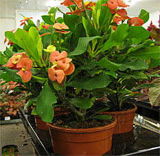 Mirdzošā eiforbija, (Euphorbia milii). Pie mums kā telpaugi pazīstamākās ir trīs gana atšķirīgas eiforbijas – Āfrikas piena koks, puansetija (pointsettia) un mirdzošā eiforbija, kas atgādina sausu, ložņājošu krūmu ar mazām, zaļām iegarenām lapiņām un nelieliem sarkaniem ziediņiem, kas uz sausā adatainā krūma izskatās gana dekoratīvi. Šis sukulents pieder eiforbiju (Euphorbiaceae) dzimtas, eiforbiju ģintij. Dzimtu latviski sauc arī par dievkrēsliņu dzimtu.